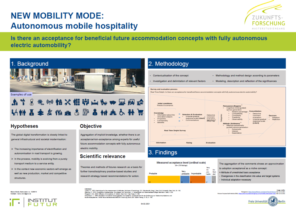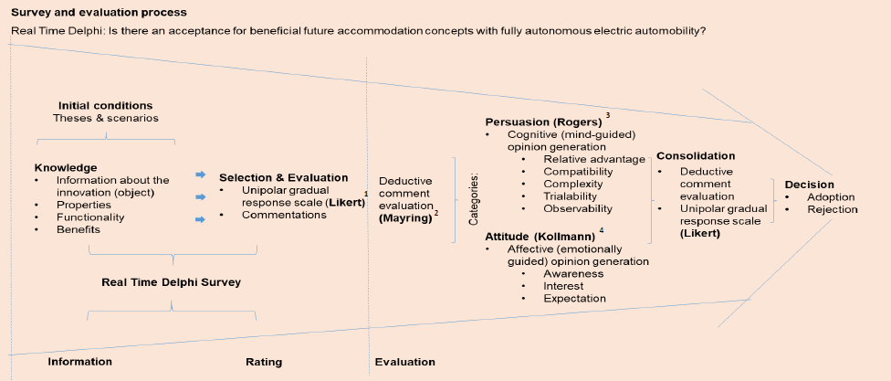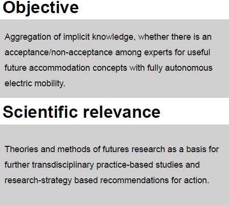 Specifically, the future research method Real Time Delphi was used to ask 239 experts about the acceptance/non-acceptance of future beneficial accommodation concepts with fully autonomous electric mobility and the implicit knowledge was aggregated for the evaluation.