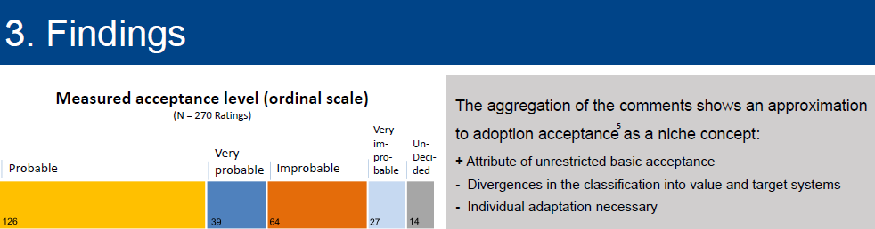 The aggregation of the comments showed an approximation of adoption acceptance at least as a niche concept. Although the attribute of unrestricted basic acceptance is fulfilled, divergences in the classification in the societal value and target systems are still recognizable and individual adjustments in the concepts are necessary.